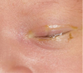 • Either a watery discharge or a yellow-green discharge from the eye which dries when your child sleeps, causing crusting around the eyelids